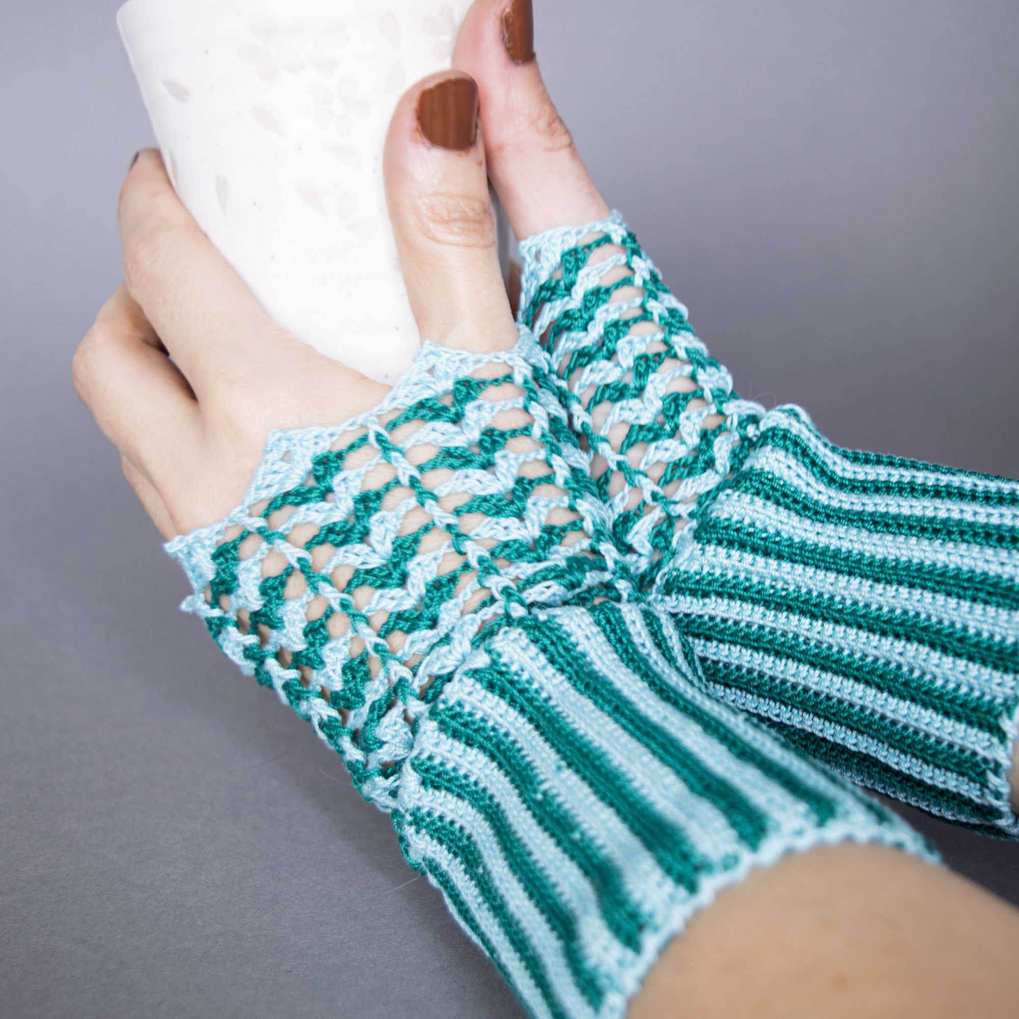 Sie sind aus 100% Baumwolle in zwei Blautönen mit Häkelstichen gefertigt, einer für die Stulpe und einer für den Handbereich.